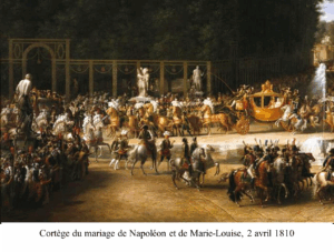 Effectivement, la rumeur est fondée. Tout en pensant avec nostalgie « à la bonne Joséphine qu’ils aimaient voir autrefois au balcon du château pendant les revues », la Garde, à Saint-Cloud, se prépare à accueillir la nouvelle impératrice pour le mariage civil, le 1er avril, célébré dans l’intimité aux côtés des membres de la famille. Le lendemain à Paris, un régiment de la Jeune Garde est sous les armes à 5h30, alors que l’Empereur et la jeune impératrice arrive aux Champ Elysée par le Bois de Boulogne, à midi. Les salves d’honneur des canons peinent à couvrir le fracas sur les pavés des roues ferrées des 36 voitures, attelées jusqu’à 8 chevaux, des grands officiers et de la famille impériale.