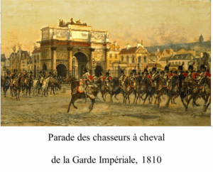 Juin1810 : les préparations d’une grande fête prévue le 24 mobilisent toutes les unités de la Garde, au moins partiellement. Le montage des tribunes et d’une salle de bal dans l’enceinte de l’Ecole militaire écourte et compromet les temps de sommeil nocturnes. C’est le grand jour. Dès 3 heures du matin, les officiers rejoignent leur unité avec leur tenue de gala sous le bras. Préparation des tenues, lustrage des sabres, astiquage des cuirs, taillage des moustaches et favoris, ajustement des décorations, fignolage des perruques, puis inspections, revues, répétitions s’enchaînent sur près de 12 heures.