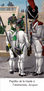 En avril 1811, une centaine de très jeunes hommes choisis dans chaque régiment de la Jeune Garde en Espagne rejoignent Fontainebleau pour former une école militaire attachée à la Vieille Garde. Ce bataillon d’instruction de la Garde formera des sous-officiers de valeur bien encadrés et préparés aux rigueurs du service en campagne et du temps de guerre. Par la mise en place d’une direction des études avec un programme incluant formation militaire et instruction générale (grammaire et arithmétique), cette école de Fontainebleau préfigure nos écoles militaires d’aujourd’hui, par l’organisation de l’enseignement, le principe de recrutement des meilleurs éléments, les objectifs de formation, la qualité des formateurs, les exigences de solidités physique et mentale des futurs chefs.