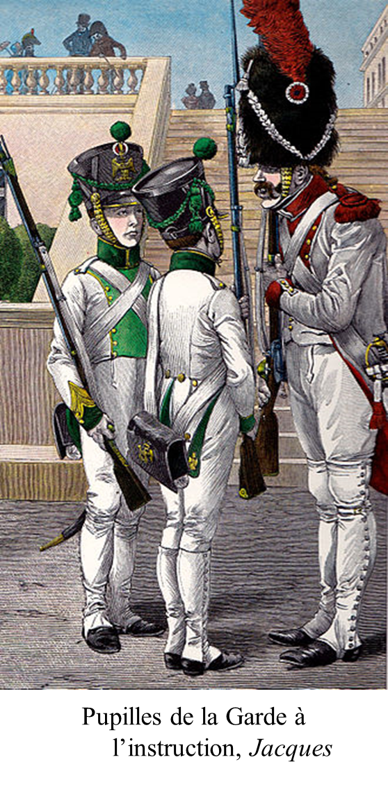 Surpris, et immédiatement attentif à leur bien-être, il émet l’idée de mettre sur pied et d’intégrer à la Garde, un régiment de pupilles, d’enfants abandonnés et d’orphelins recueillis par les hospices de l’Empire, les sauvant du vagabondage, de l’exploitation et de la misère. Il insiste sur la bienveillance sur la protection à apporter à ces enfants déjà éprouvés, leur instruction et leur éducation. « Et voici « la petite Garde », la relève », plaisantent les anciens. Le colonel Tindal, chef de corps du 2e grenadiers de la Garde Impériale et chargé du recrutement, aura incorporé, au 30 août 1811, près de 8 000 jeunes Français, Italiens, Brabançons, Hollandais et Allemands. Des capitaines et des sous-officiers de la Garde assurent une instruction aussi académique que possible. Se substituer à l’instituteur, n’est pas dans leurs habitudes. Quant à leur rôle, « on verra plus tard, ce qu’on pourrait en faire ! » dira l’Empereur. En attendant, ils doivent être encadrés, éduqués avec fermeté mais mansuétude, et il est hors de question de verser dans la marine les quelques fortes têtes ou délinquants, comme le suggère le ministre de la guerre. Pour l’Empereur qui les affectionne, « ils seront décrassés, éduqués, instruits et deviendront de bons soldats et de bon français ». On comprend alors pourquoi la mission incombe à la Garde !