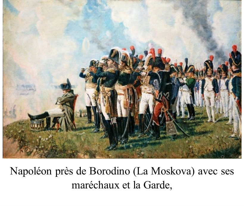 A la fin de l’été 1812, en dépit de l’absence d’affrontements déterminants, la Grande Armée réduite à 127 000 hommes en a perdu près de 50 000 (tués, blessés, malades, déserteurs) depuis Witebsk. Pour Napoléon, arrivé à moins de 120 km de Moscou, il n’y a qu’une voie possible : poursuivre la marche en avant et contraindre les russes à une bataille concluante lui permettant de dicter les termes de la paix. Le général Koutouzov ayant remplacé Barclay de Tolly lui offre cette occasion en concentrant son armée dans une plaine autour du village de Borodino, et longeant le fleuve de la Moskova. Dès le 5 septembre, l’Empereur exploite cette situation tant attendue en engageant le combat sans attendre. Le même jour, les batteries s’artillerie de la Garde appuie la prise de la redoute (ou retranchement fortifié) de Schwardino par la Ligne. L’Empereur déclare : « Soldats, voici la bataille que vous avez tant désirée ».