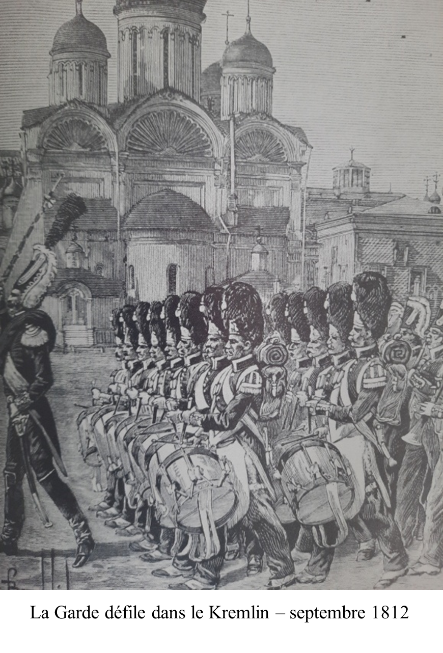 Au soir, l’Empereur et sa Garde rentrent dans les faubourgs. Tous croient toucher au but. La prise de la capitale semble justifier les sacrifices, les marches épuisantes, la misère et les combats meurtriers. A cet instant, Napoléon est persuadé qu’en tenant Moscou, il tient la Russie. Tenir la ville, c’est d’abord installer les bivouacs, comme la Vieille Garde sur de somptueuses propriétés abandonnées, et la Jeune, dans les faubourgs. Le 15 au matin, l’Empereur à la tête de la Garde, investit le Kremlin, palais des tsars. En se déployant dans la cité, les troupes découvrent des portes closes et barricadées. Pour les grognards, à qui Moscou a été présenté comme la terre promise, tout dans cette ville présente un aspect insolite et inquiétant. Il ne reste que des mendiants, des repris de justice libérés à la hâte et quelques milliers d’habitants qui n’ont pas voulu se joindre aux fugitifs. Quant aux troupes russes repliées au sud et à l’est, elles patientent et se préparent à frapper à nouveau. Le mauvais pressentiment des anciens se concrétise vers minuit lorsque d’immenses clameurs s’élèvent au milieu des flammes. « Les russes brûlent leur capitale ! ». Un détachement de la Garde sous les armes se presse autour de l’Empereur sous une voûte de feu, alors que le général de Lariboisière le supplie de se retirer. Finalement, il ne quitte le Kremlin que le 16 vers 17 heures pour le palais de Petrovskoïe, à 4 kilomètres au nord-ouest de Moscou, suivi de sa Garde courant à toute jambe, colonne par un, à travers le brasier. Au prix « de capotes brûlées, de bonnets grillés et de moustaches roussies », la Vieille garde ayant sauvé son chef regarde avec effarement l’immense bûcher. L’Empereur ne rejoint le Kremlin que le 18 septembre au travers de monceaux de ruines encore fumantes et la Garde reprend ses postes. Pourtant la vie s’organise dans une ville dévastée par l’incendie en déployant des hôpitaux de campagne ainsi que des dépôts de vivres et une aide improvisée aux sinistrés. Au Kremlin, on découvre une cache où sont entassés rhum, café, sucre, chocolat, poissons salés, thé, viande et confitures, bien peu pour rassasier 100 000 hommes, mais incitant au pillage dans l’espoir de trouver d’autres butins. Peu à peu, le désordre s’installe avec une mauvaise distribution des stocks de farine et d’avoine, des unités vivant d’abondance et d’autres de disette. Entre temps, Koutouzov, au sud de la ville, fourbit ses armes et l’armée russe devient de plus en plus active. Déjà, des essaims de cosaques dressent des embuscades meurtrières, comme celle du 25 septembre causant la perte de 80 dragons de la Garde en mission de reconnaissance.