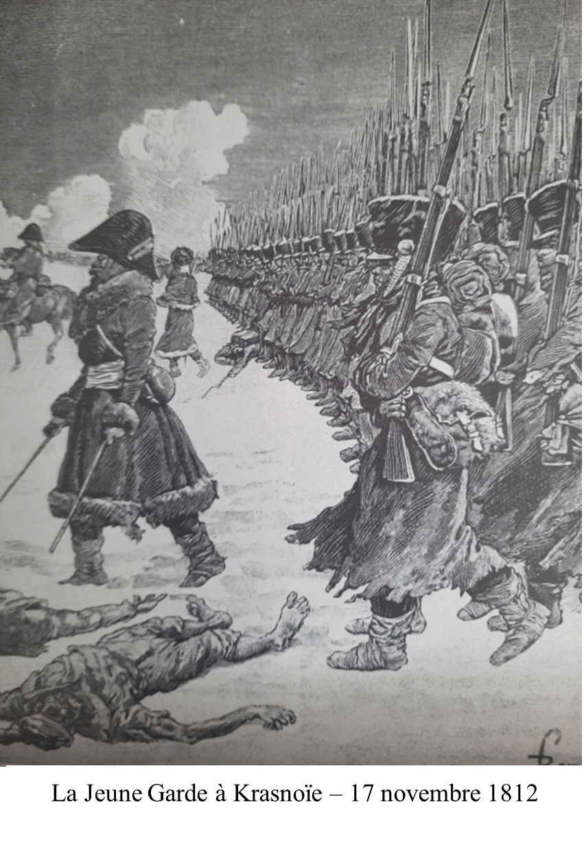 Dans ces conditions dramatiques, Napoléon se rend compte que la position de Smolensk est intenable et choisit de poursuivre la retraite. Mais la situation va évoluer vers un inévitable affrontement au niveau de la ville de Krasnoïe. A son approche, les colonnes françaises s’étendent sur plus de 60 kilomètres et les unités ne sont plus en ordre de bataille. Le 14 novembre, la tête de l’armée française, passe la ville et continue sa marche à l’ouest vers Orcha. Le lendemain, Napoléon, avec ses 16 000 hommes de la Garde Impériale, arrive à son tour à Krasnoïe où il pense rester quelques jours, afin de permettre aux corps d’armée d’Eugène de Beauharnais, de Davout, et de Ney en arrière garde de le rejoindre pour poursuivre la retraite. L’Empereur, qui commande personnellement la Garde Impériale, marche sur les hauteurs situées le long de la route, où sont postées les forces russes impressionnées par l’ordre et le calme des unités d’élite de la Garde, malgré les déluges d’artillerie. Le général russe Denis Davidov, chef des francs-tireurs, témoignera, en faisant allusion à l’héroïsme du major des grenadiers à cheval de la Garde Remy Exelmans : « […] Dans l’après-midi, on a aperçu la Vieille Garde, entourant Napoléon […] Je n’oublierai jamais l’incroyable résolution de ces soldats, pour qui la menace de la mort est une expérience quotidienne et familière. Avec leurs grands chapeaux en peau d’ours, leurs uniformes bleus, leurs ceintures blanches, leurs panaches rouges, leurs épaulettes, ils ressemblaient à des pavots sur le champ de bataille enneigé […] La Garde Impériale avec Napoléon parmi eux traversa les rangs de nos cosaques comme un navire de 100 canons aurait traversé une flottille de bateaux de pêche ». L’Empereur, rentré dans la ville en ayant chassé les derniers escadrons de cosaques qui la défendaient la ville, met à profit ce succès pour lancer le général Roguet et la Jeune Garde dans une attaque surprise au sud contre un cantonnement de 3 500 russes mis en déroute. Mais la situation devenue gravissime pour Eugène et Davout, bousculés et au bord de l’anéantissement, alerte l’Empereur sur les périls qui menacent son armée. Une attaque déterminée de Koutouzov serait la fin de la Grande Armée. C’est alors que Napoléon prépare sa Garde Impériale pour feindre une offensive contre le gros de l’armée russe. L’artillerie de la Grande Armée est rassemblée comme pour une offensive et la Garde se met d’elle-même en colonnes d’attaque. Napoléon fait le pari que cette manœuvre inattendue dissuadera les Russes d’attaquer Davout et permettra au reste du corps d’Eugène d’engager la retraite. À 5 heures de l’après-midi du 17 novembre, 11 000 soldats de la Garde sortent de Krasnoïe pour sécuriser le terrain aux abords de la ville ravagée par l’incendie, vers l’est et le sud-est.